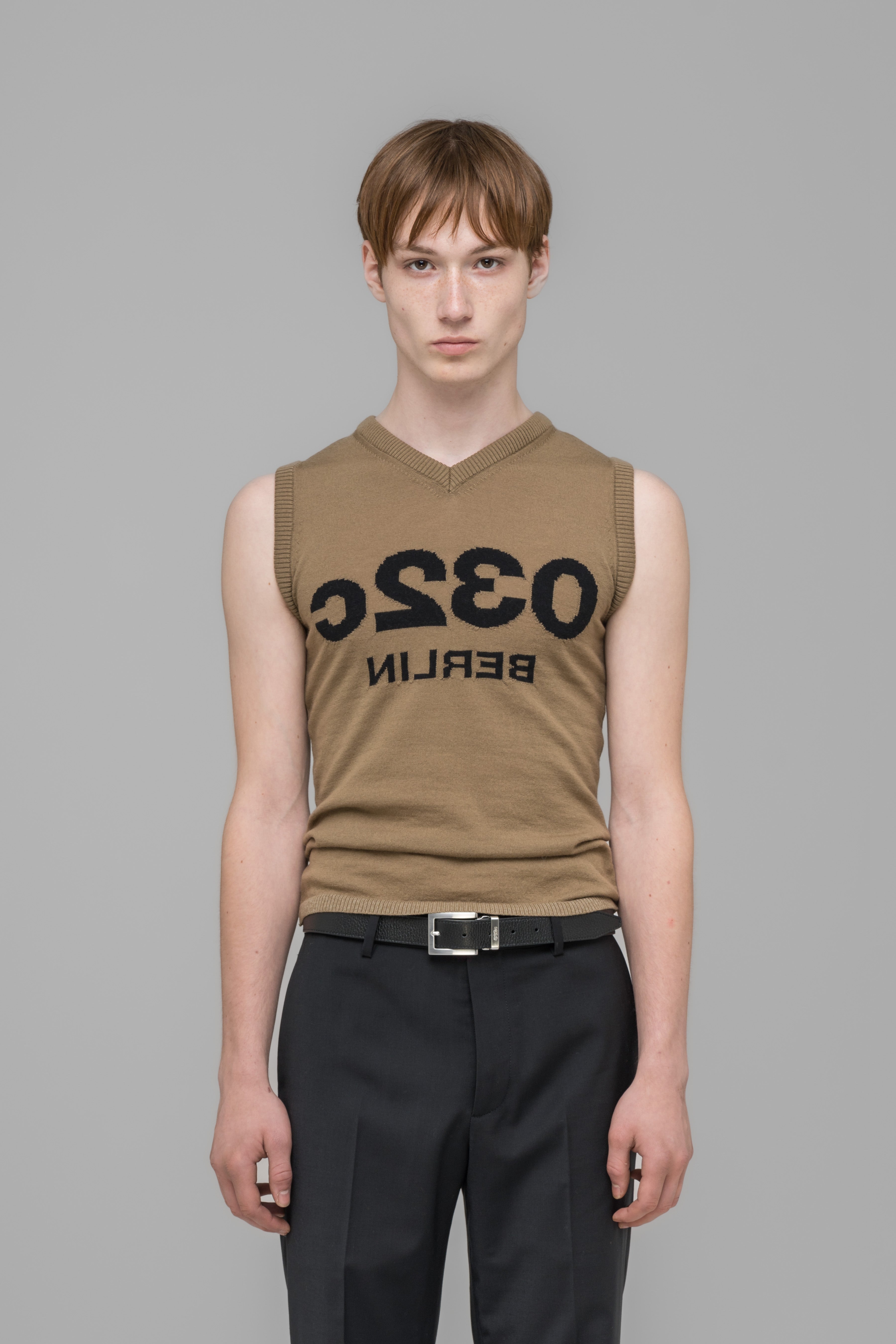 The selfie vest, made from soft merino wool, features the iconic mirrored 032c Berlin inserted jacquard artwork on the front and has ribbed armholes, neckline, and hem.