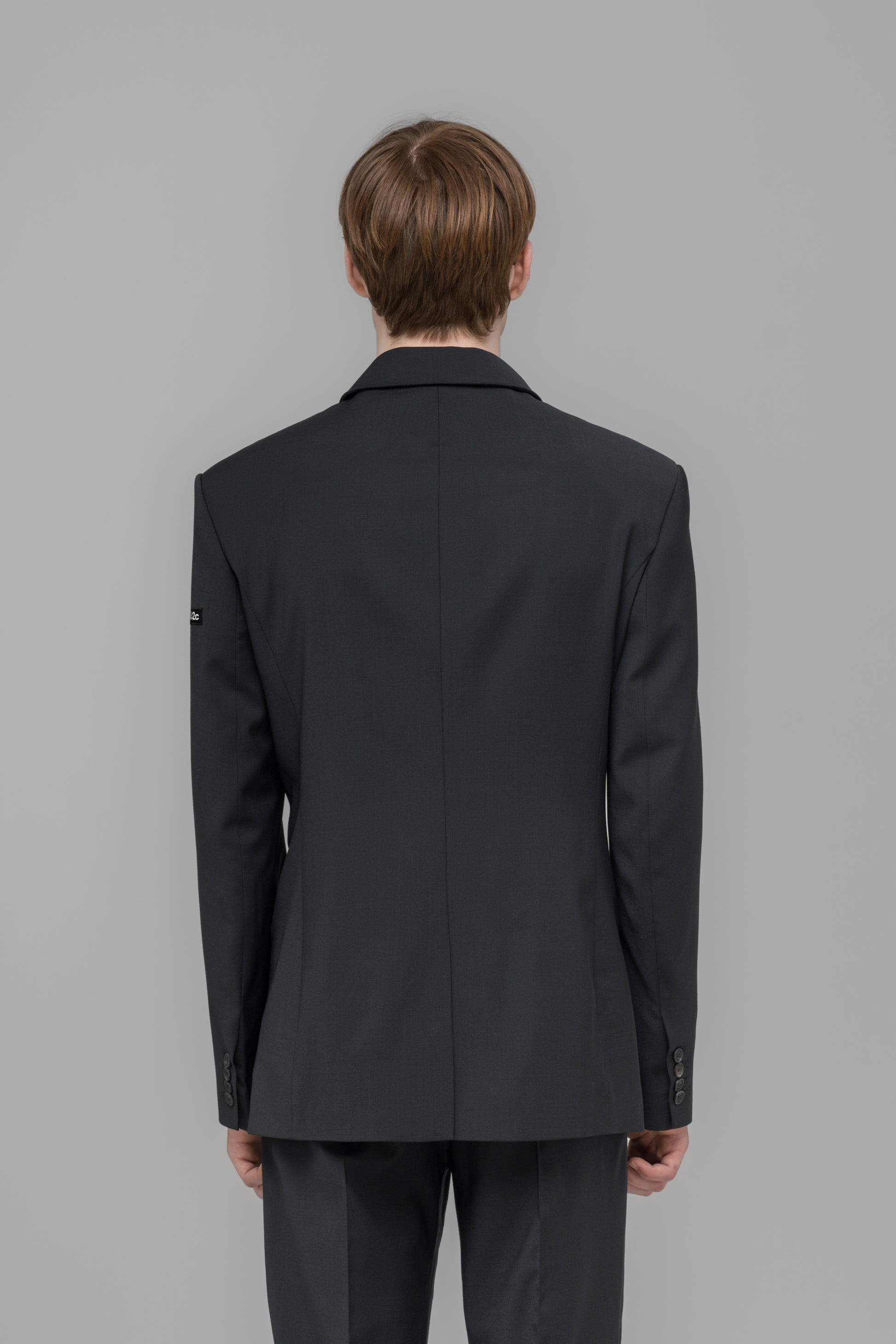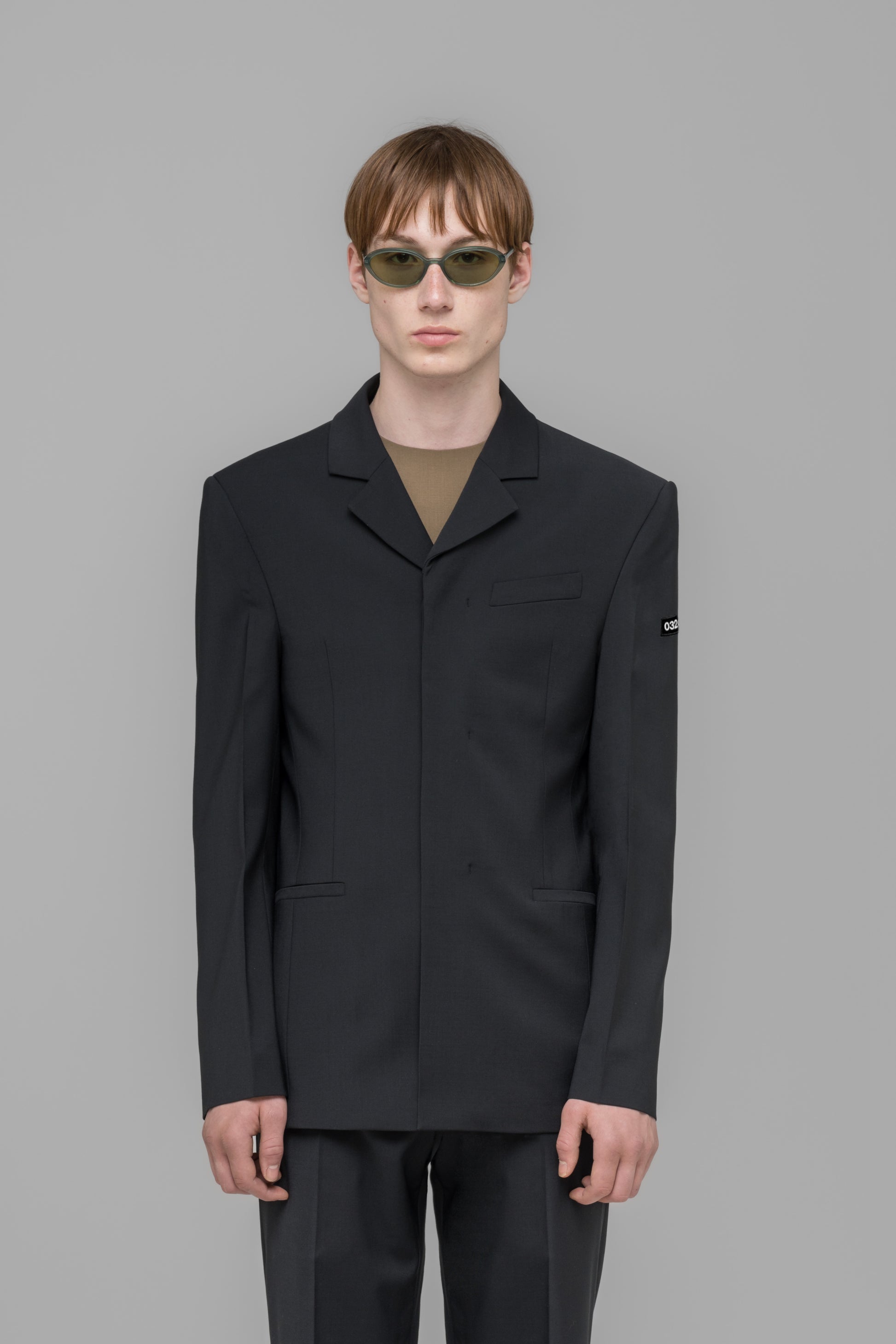 Single-breasted suit jacket with an accentuated waist, featuring a concealed button closure, front sleeve press creases, a back vent, and classic viscose lining, finished with a contrasting undercollar felt and small embroidered 032c logo patch.