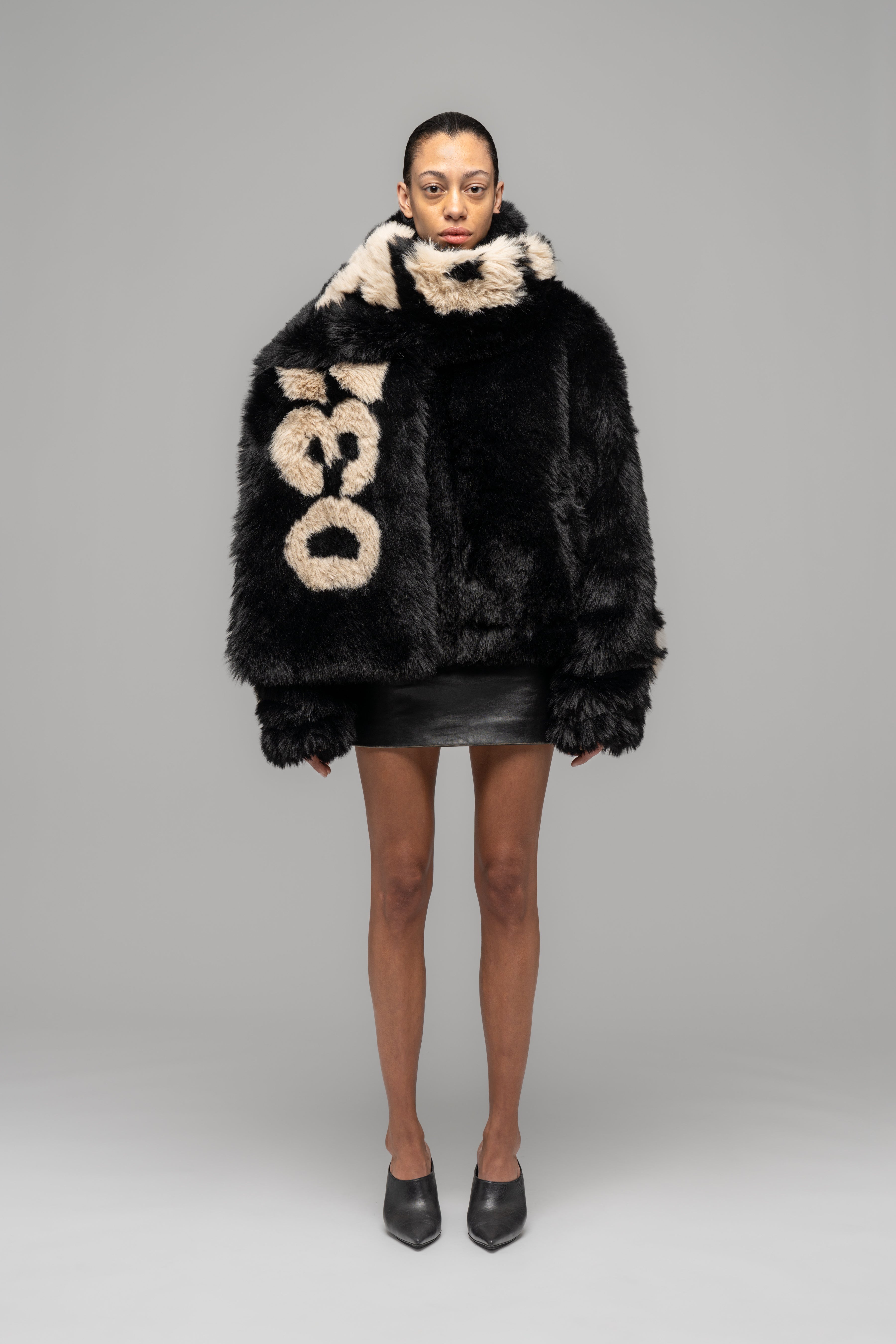 Bi-color faux fur scarf with iconic 032c Workshop inserted jacquard artwork on the front. Worn around your neck, it will protect you from the cold and keep you safe during the winter.