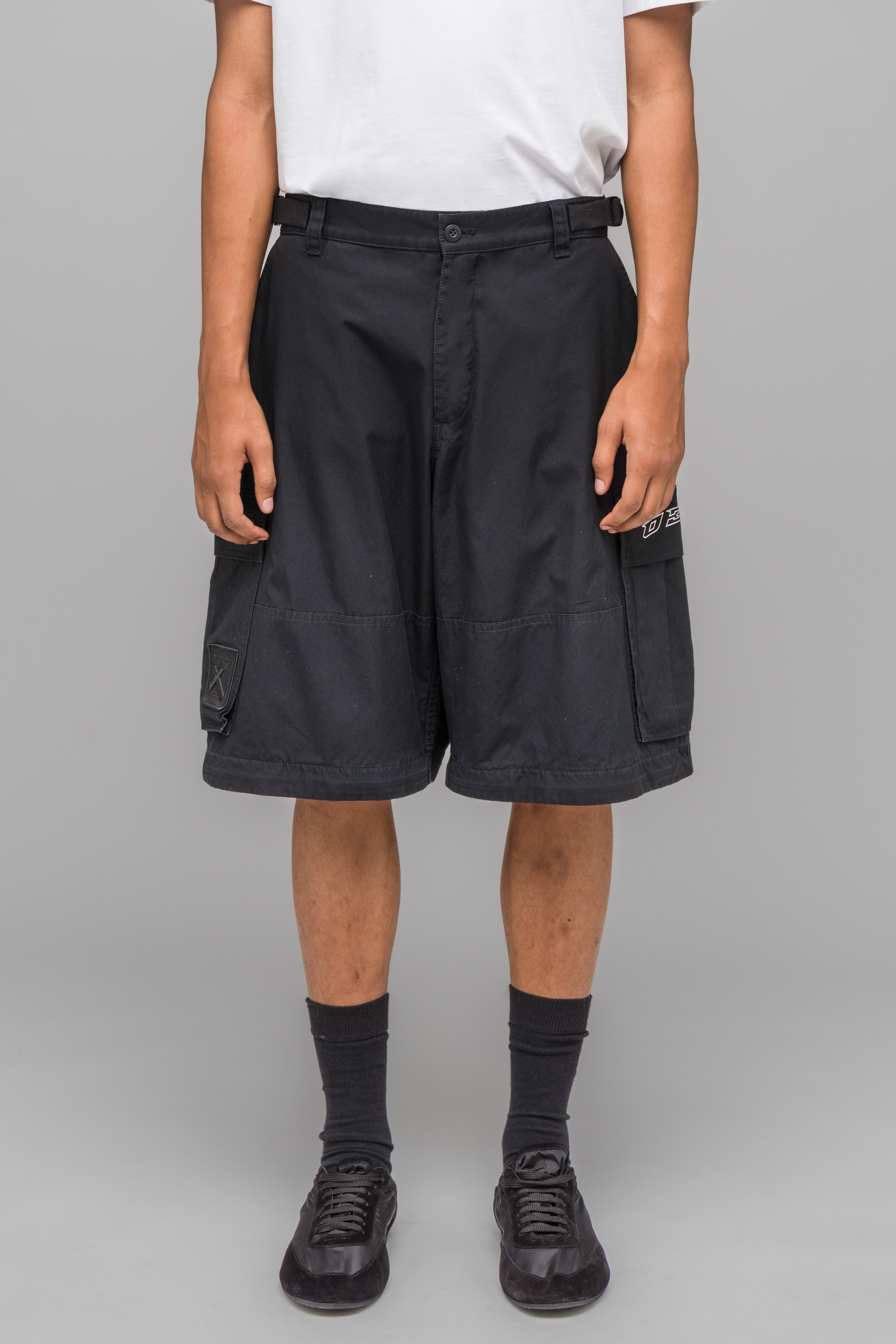 Oversized cargo pants with zip-detachable legs, side cargo pockets, adjustable waist, embroidered “Fainting Cross” patch, and “Speedy” logo screen print.