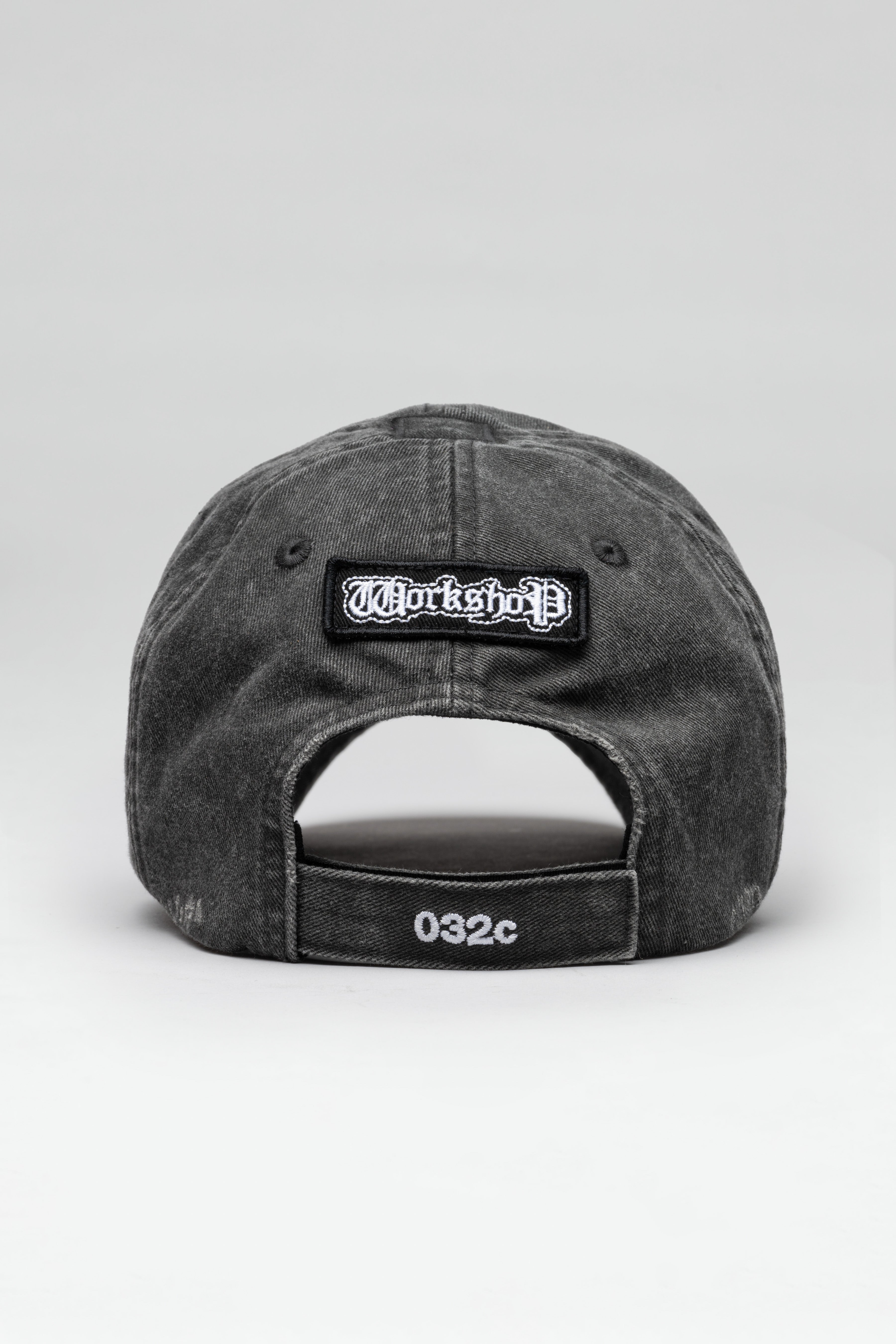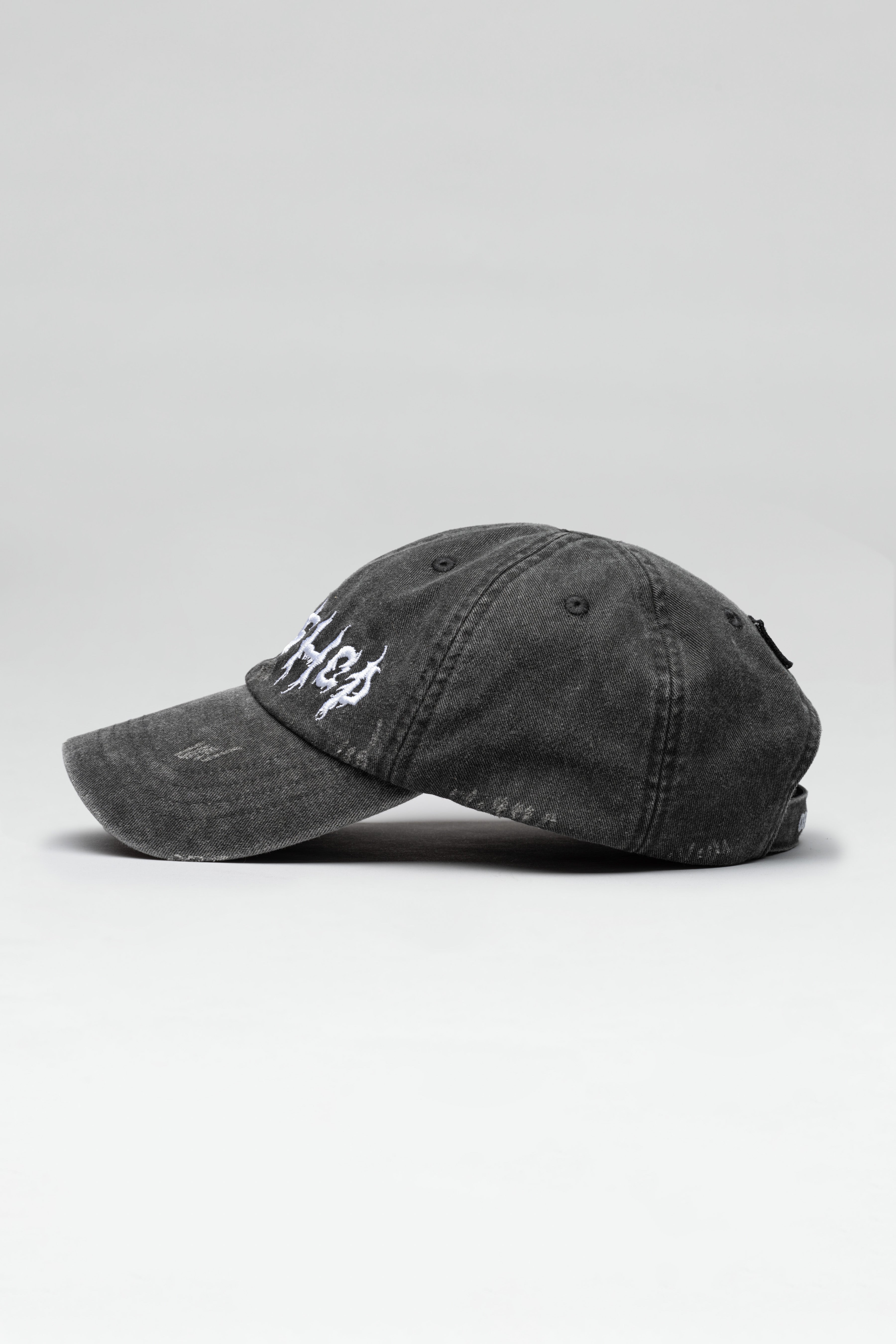 6-panel cap in washed black, featuring a Velcro closure and distressing. Equipped with shiny seasonal artwork embroidery and a patch.