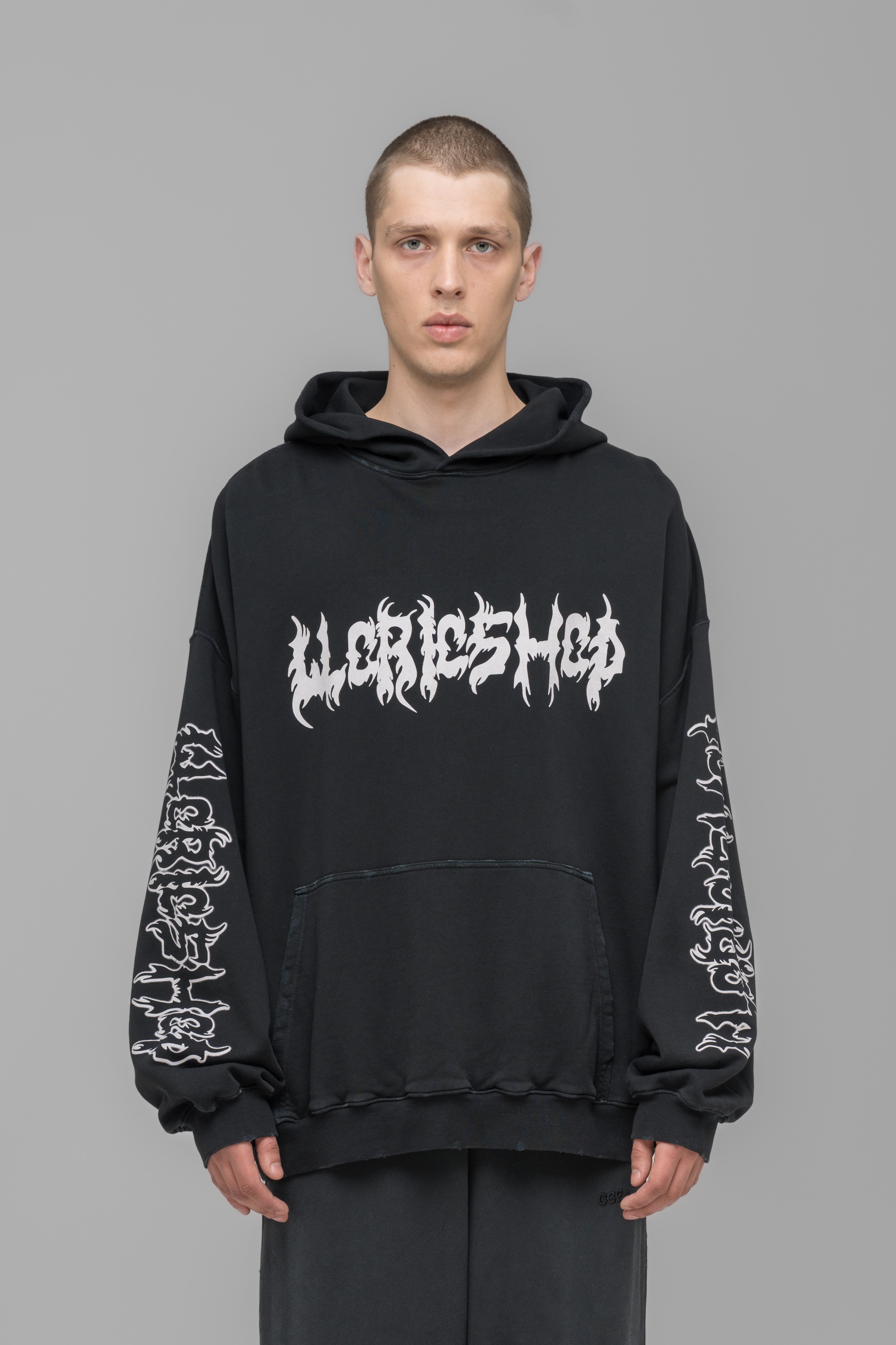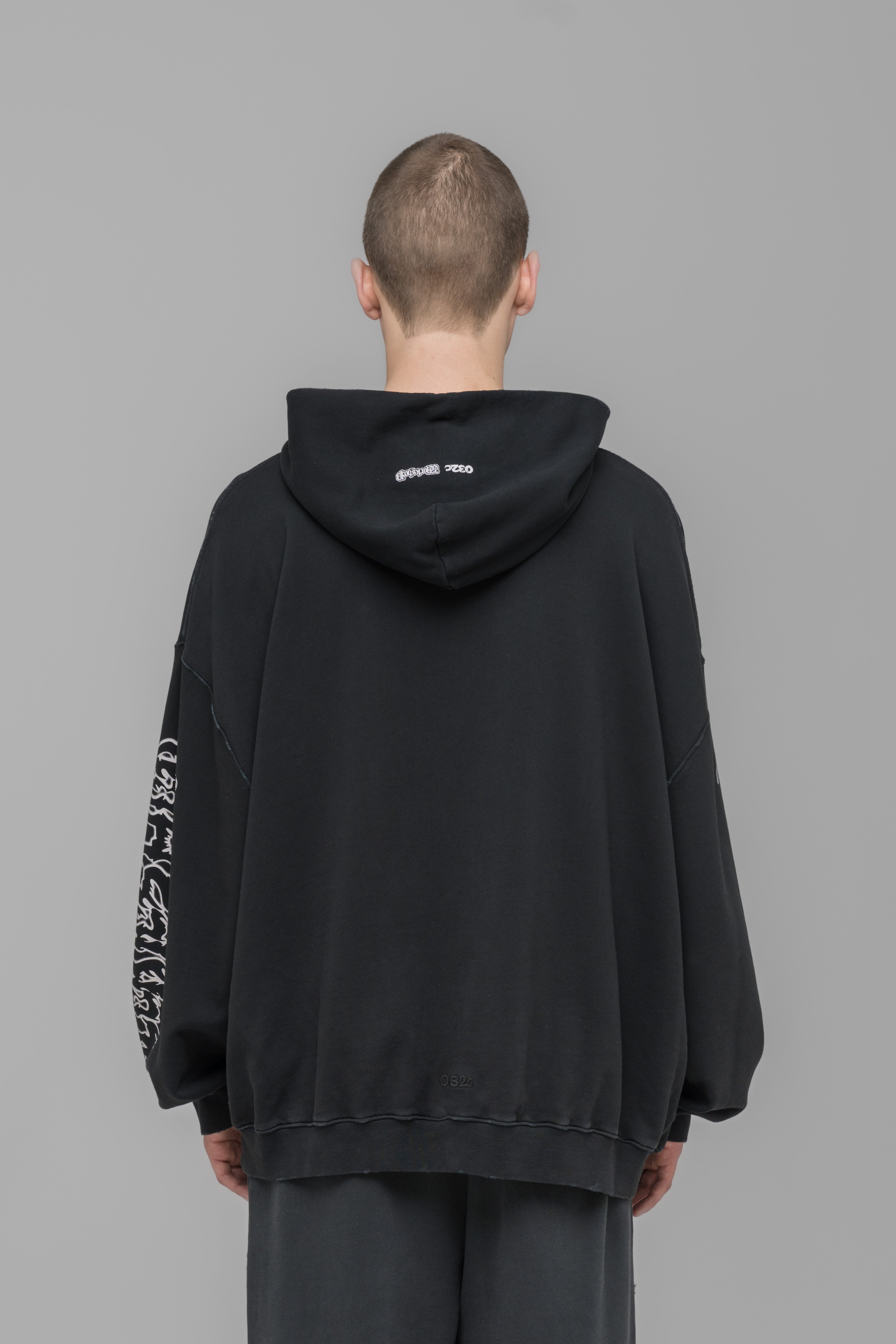 Oversized hoodie, featuring a front kangaroo pocket in looped back fleece. Equipped with distinct 032c embroidery and single stroke screen print seasonal artwork.