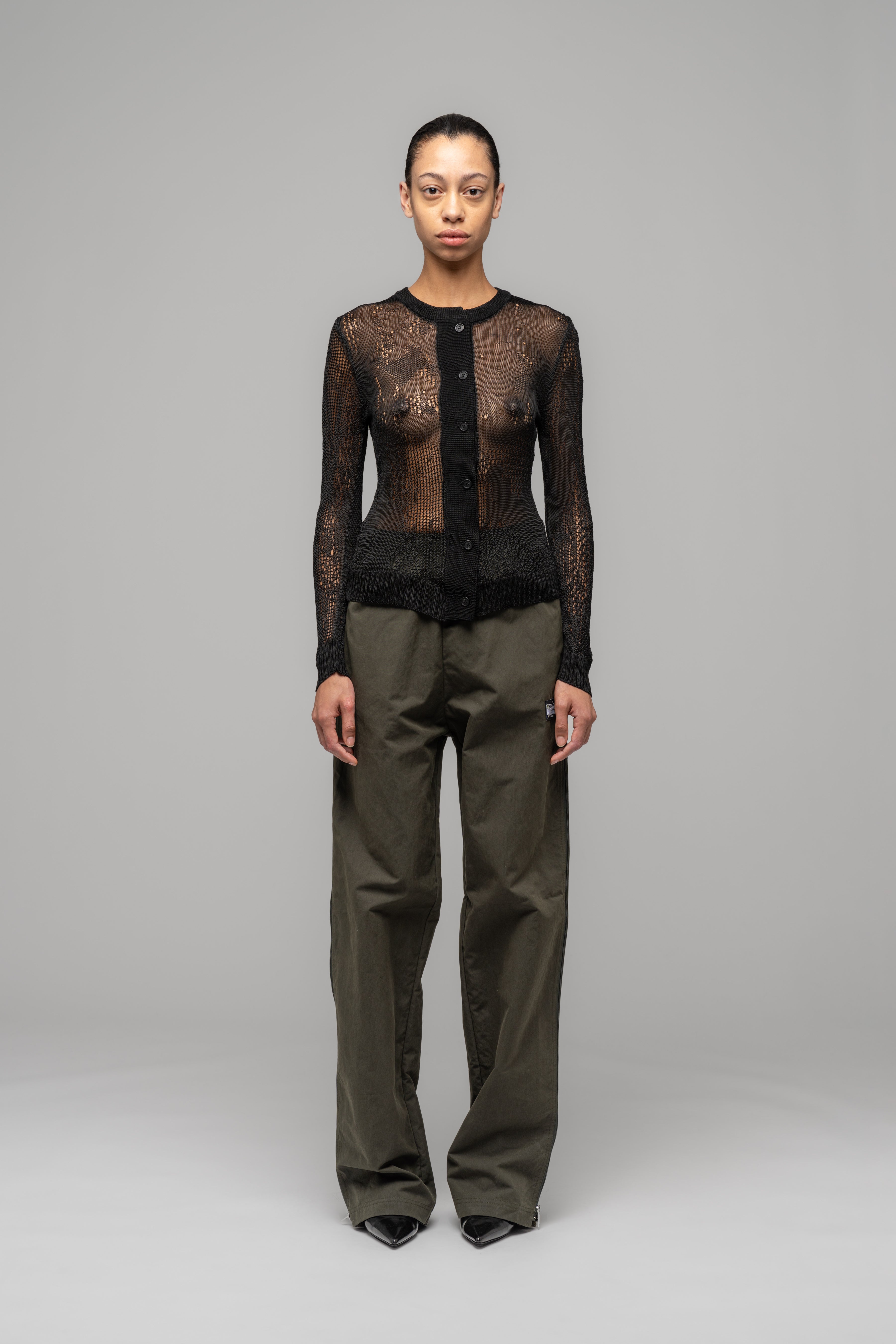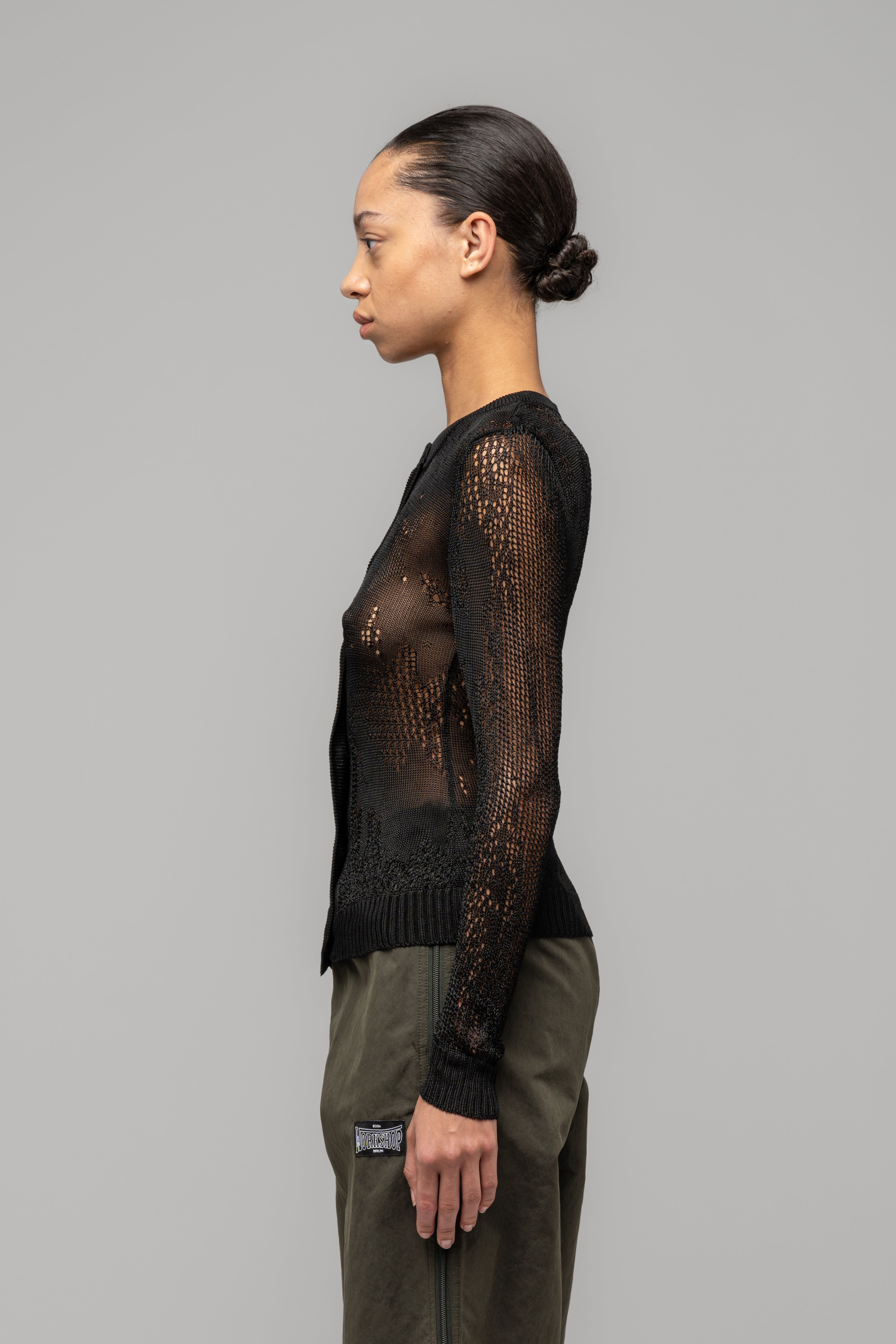 Tight fit knit cardigan with a lace / broken viscose stitch and visible button closure at the front.