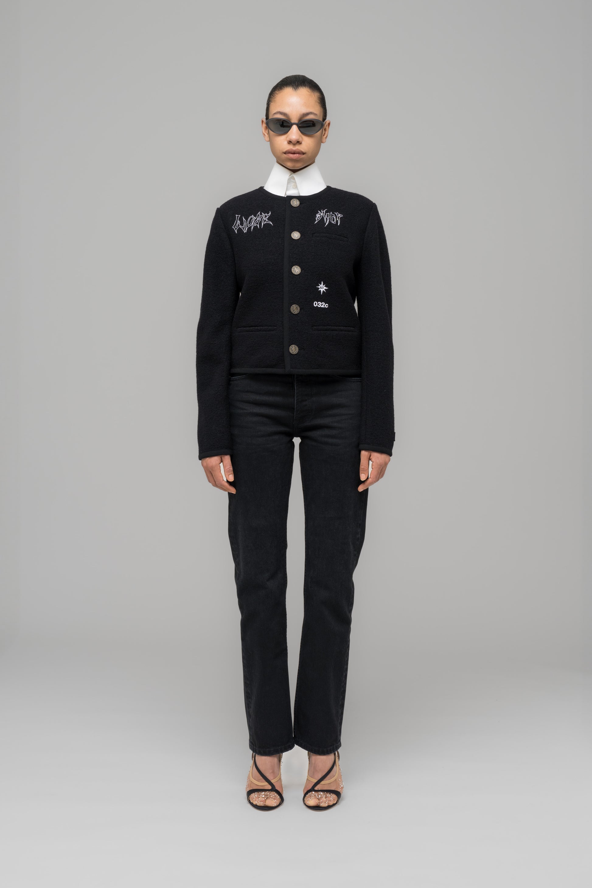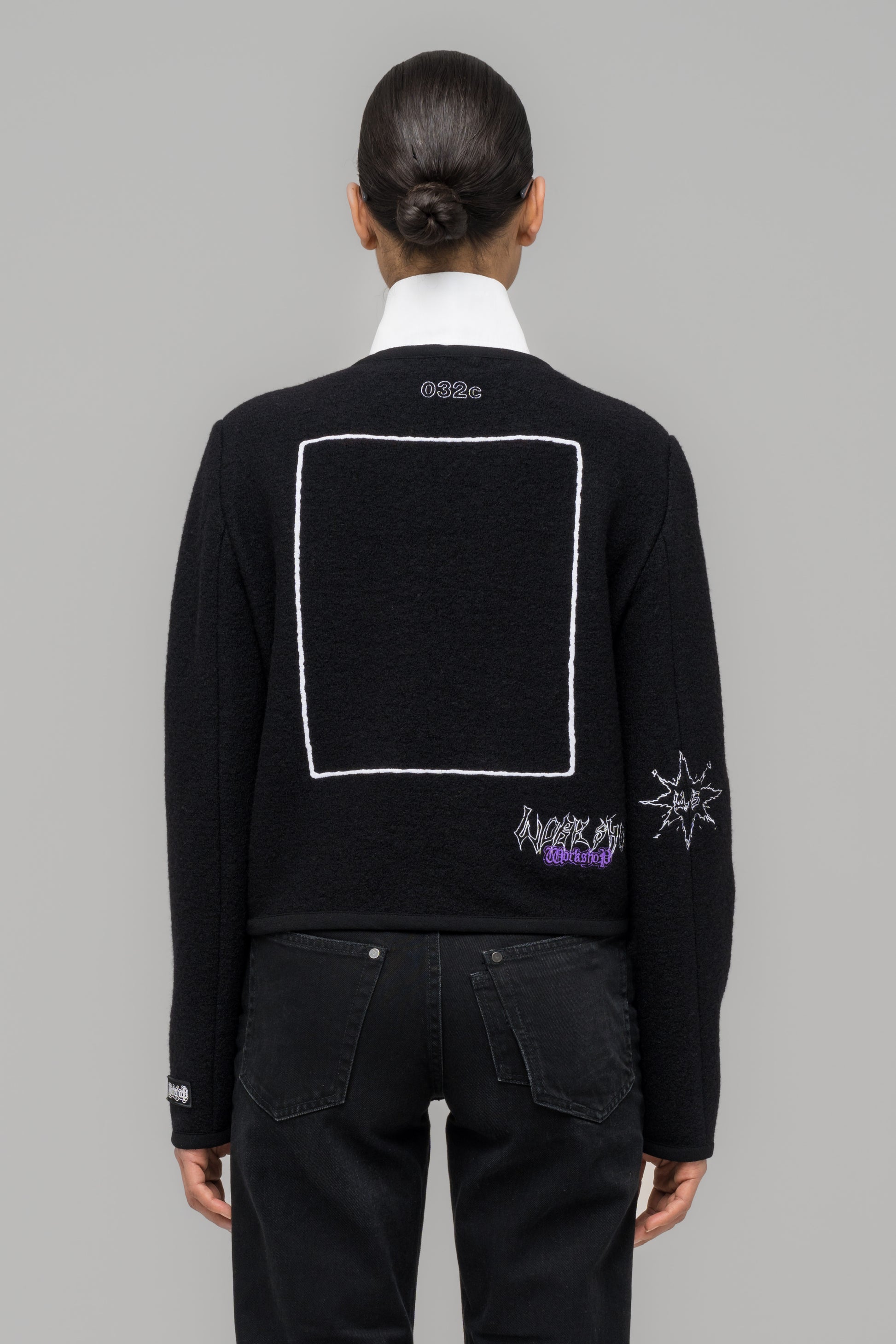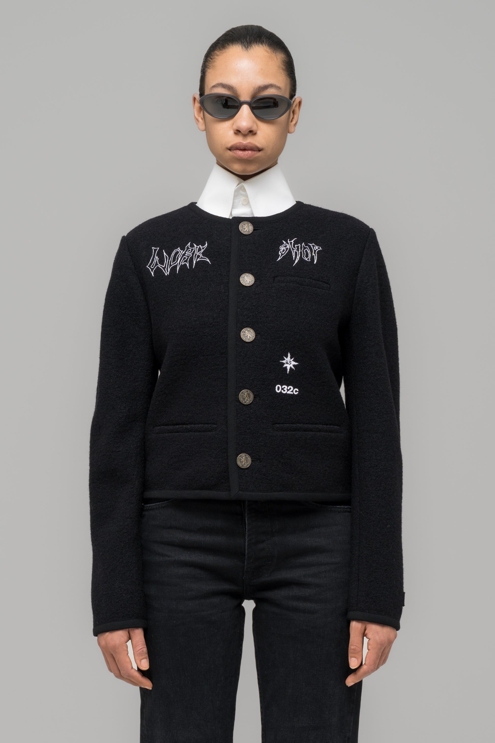 Janker in boiled wool with bound edges and welt pockets, featuring metal branded buttons, 032c logo embroideries, and a Workshop sleeve patch.
