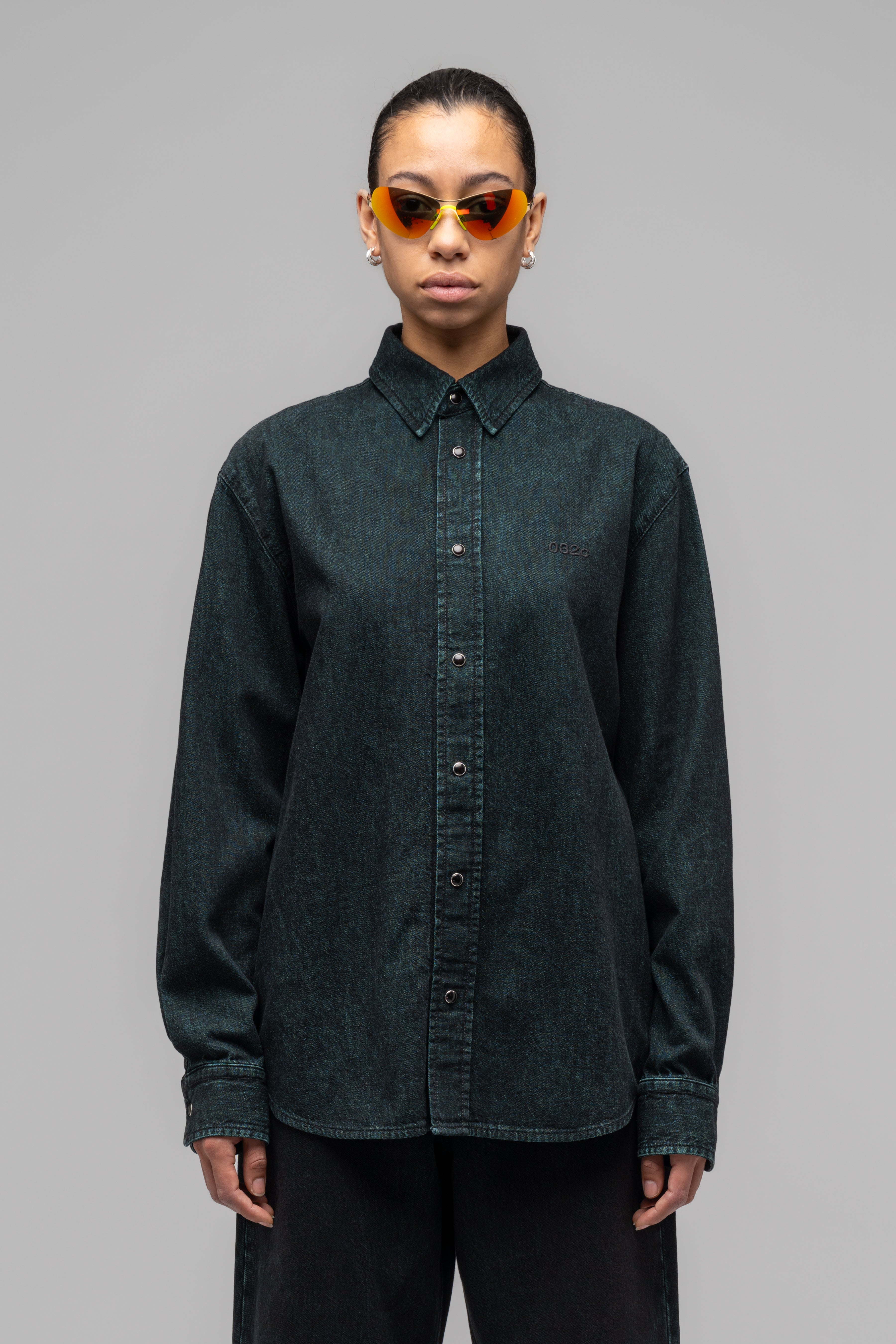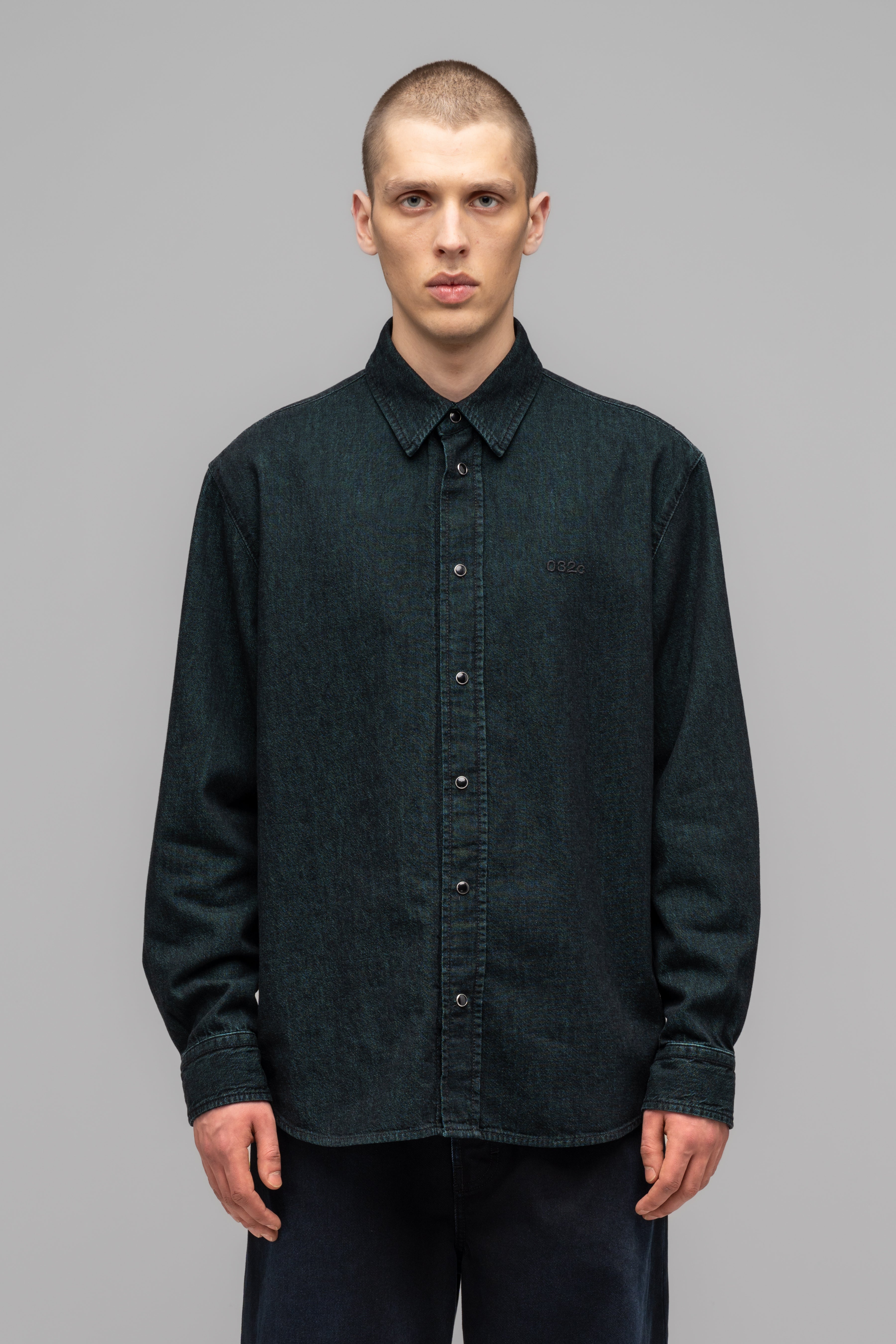 Regular cut denim shirt with a special overdyed moon wash treatment. Equipped with a Mother of Pearl snap-through front.