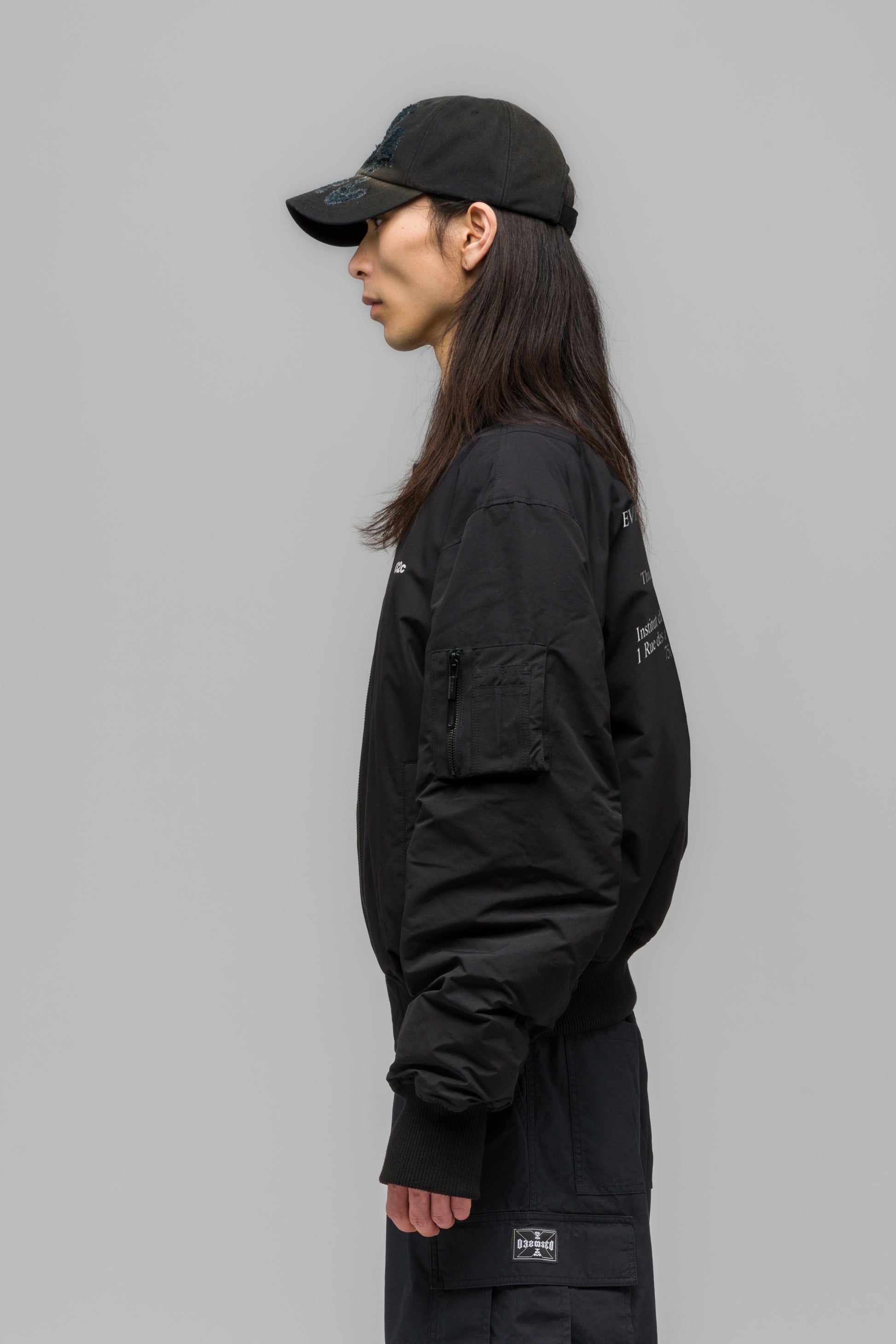 Relaxed-fit zip-through bomber jacket with welt and sleeve pockets, cotton rib collar and cuffs, padded viscose lining, and signature 032c metal zipper puller with thumb hole detail.