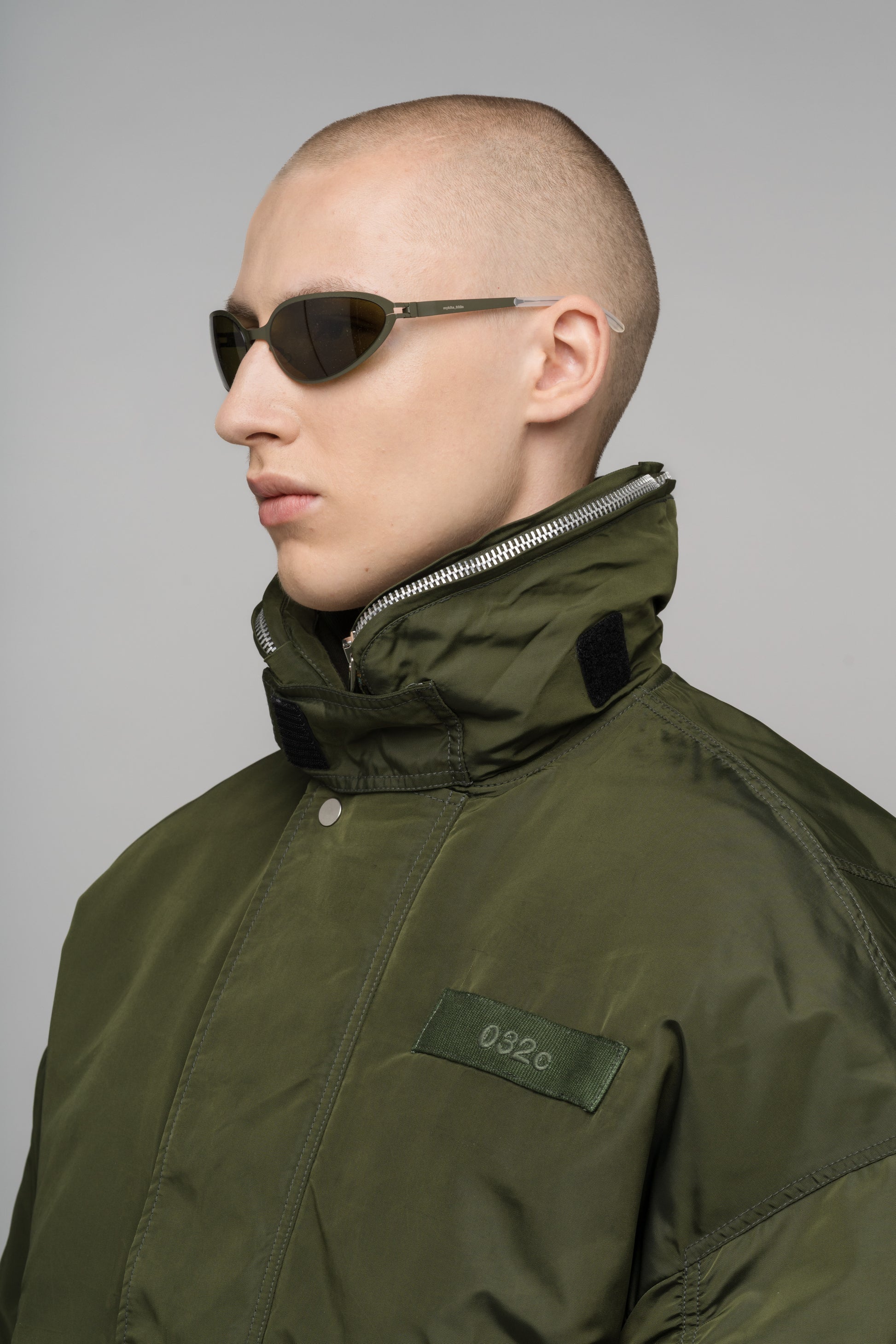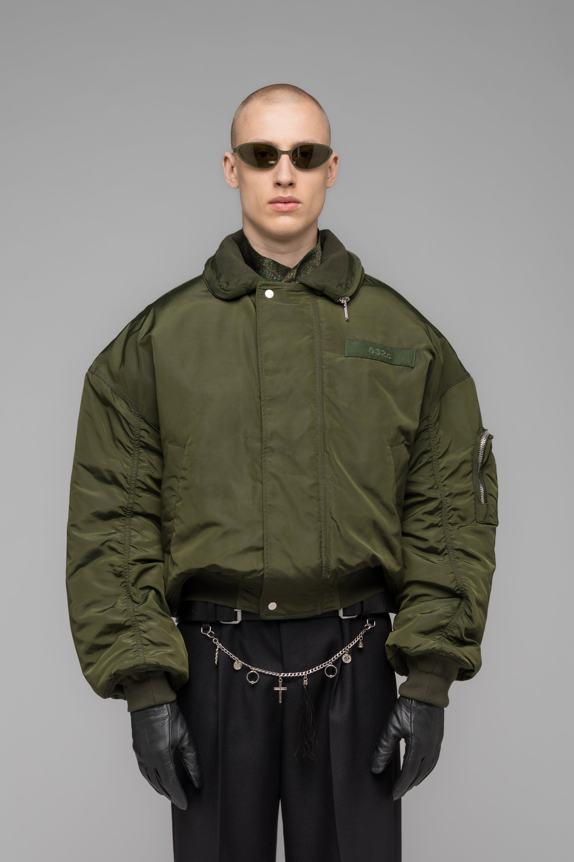 Relaxed-fit bomber jacket in heavy oxford fabric with a two-tone drop-dye effect and water-repellent finish, featuring welt and sleeve pockets, a hidden-hood collar, ribbed cuffs with thumb holes, a branded zip puller, and a 3D embroidered 032c Workshop logo on the back.