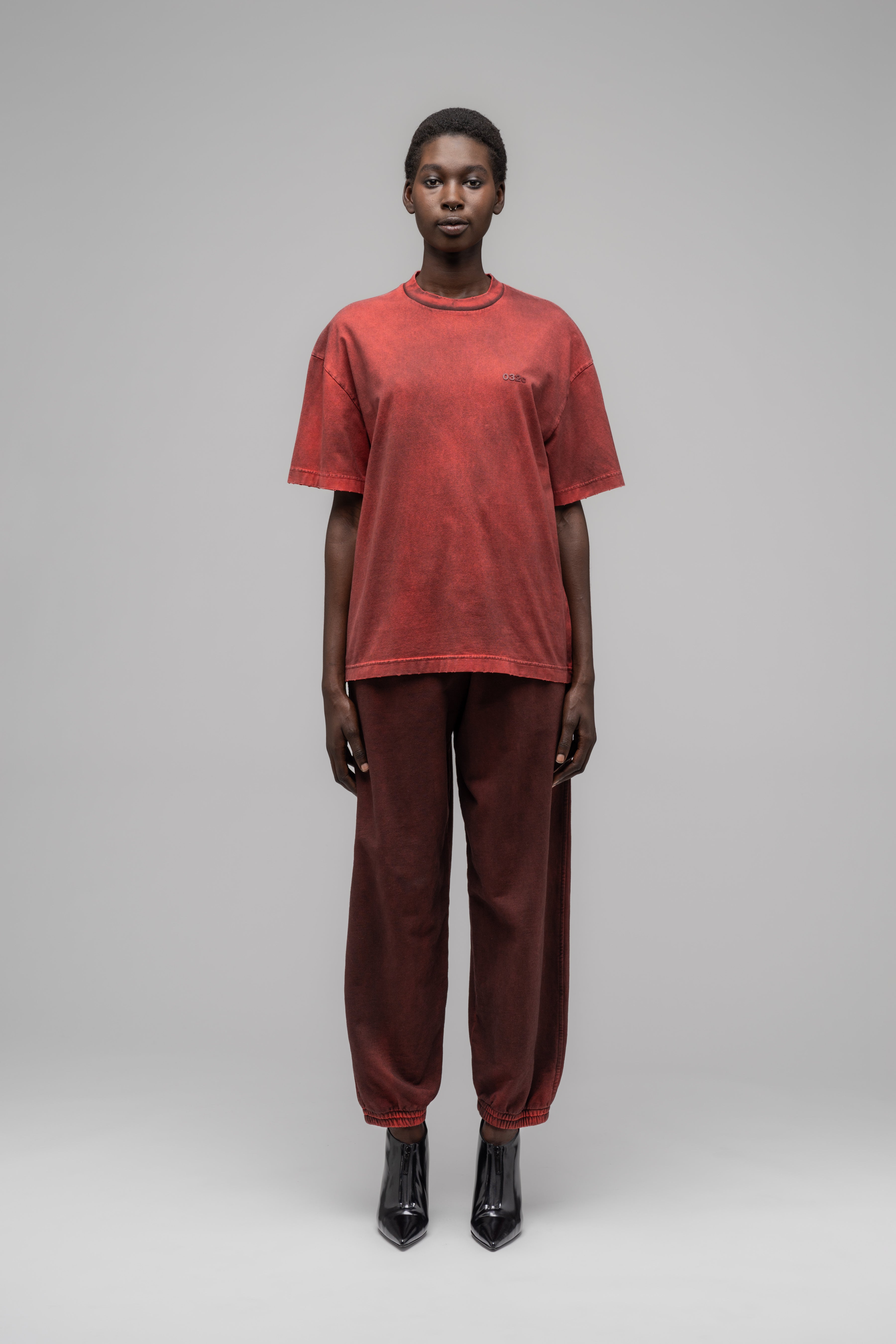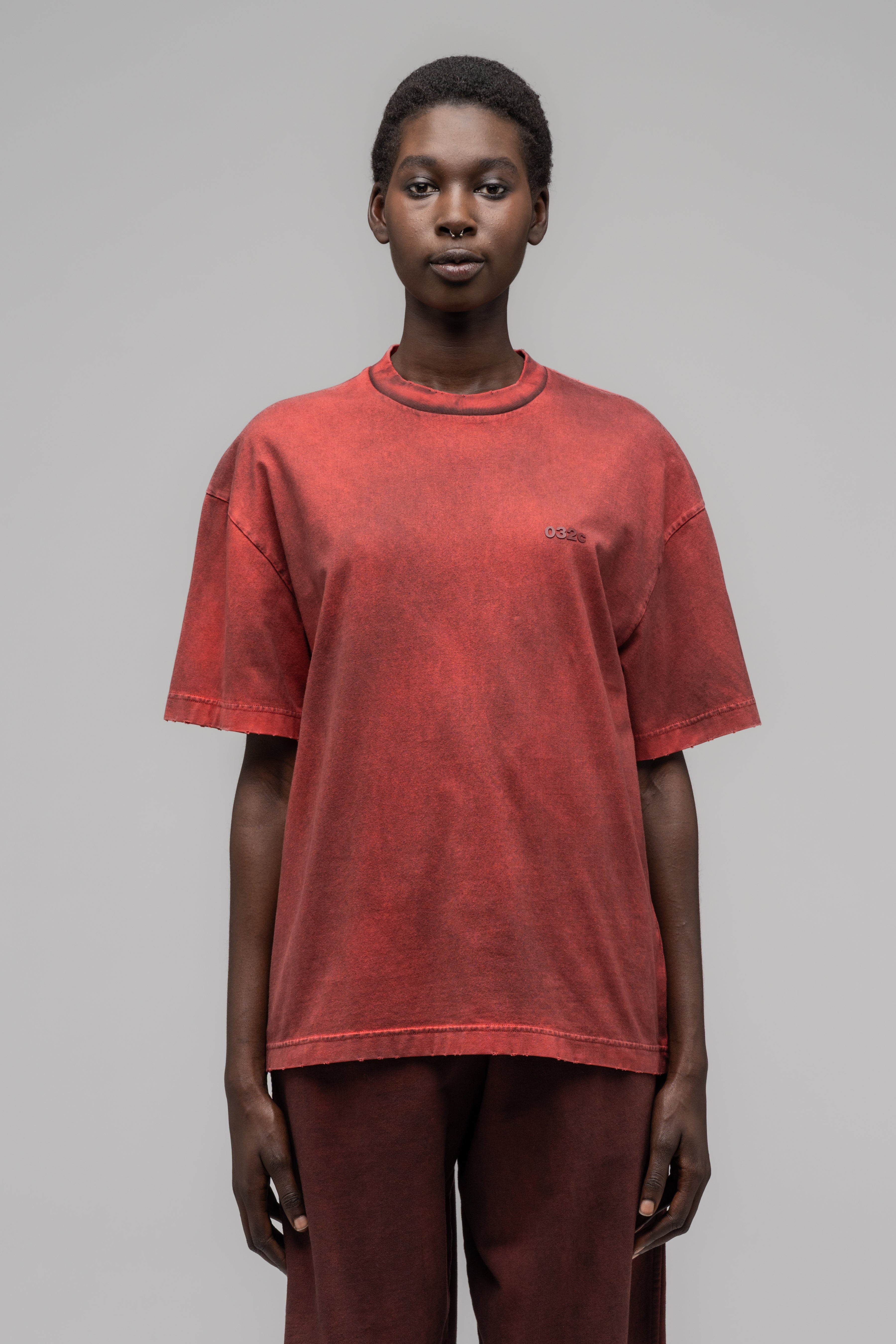 This distressed regular cut t-shirt comes in a stained red for an overall vintage feel.