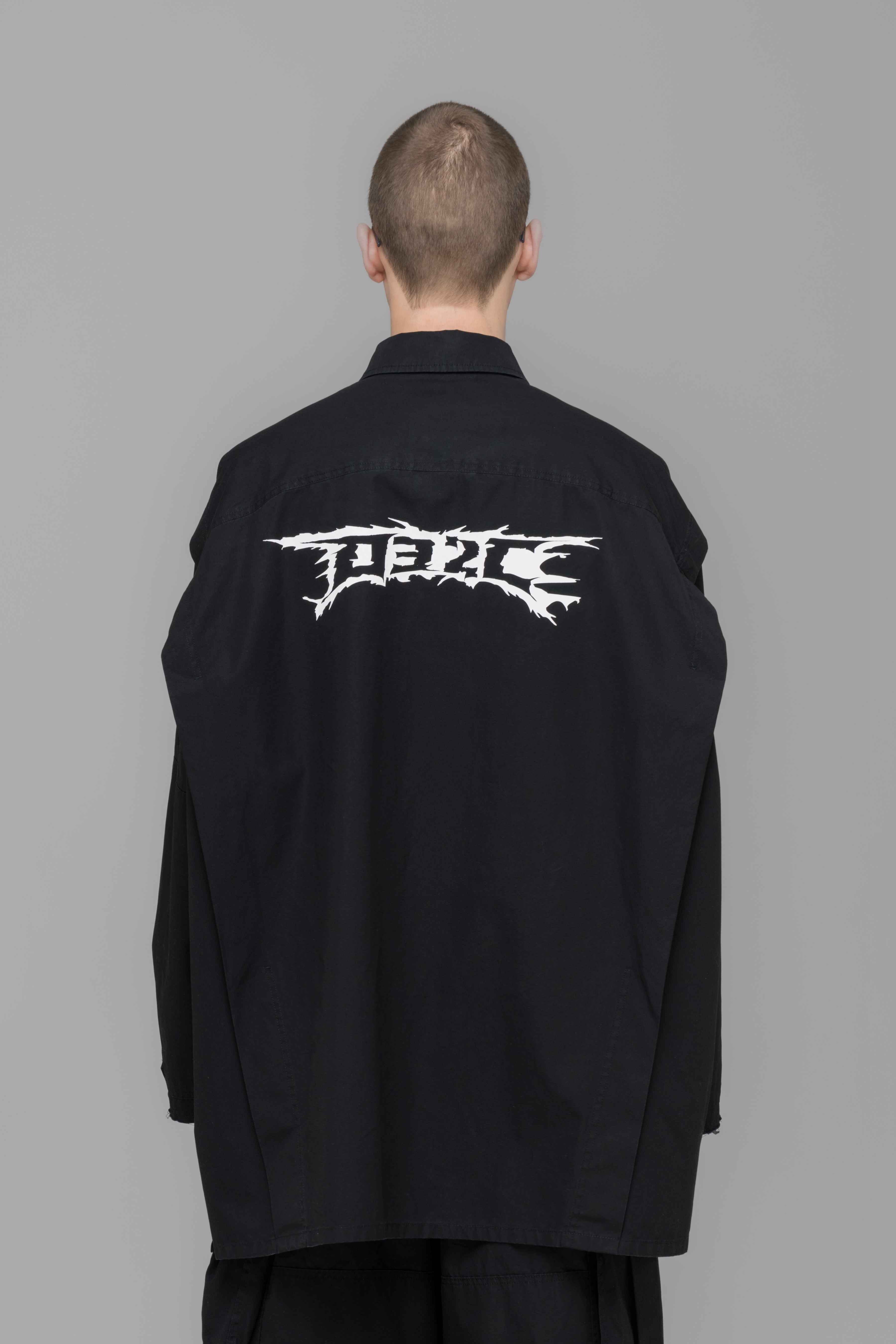 Cargo overshirt with four patch pockets on front, double layer sleeve with raw edge, two button sleeve adjusters and shoulders are constructed with a pleat. Equipped with a woven label on the chest patch pocket and a seasonal artwork screenprint on the back.