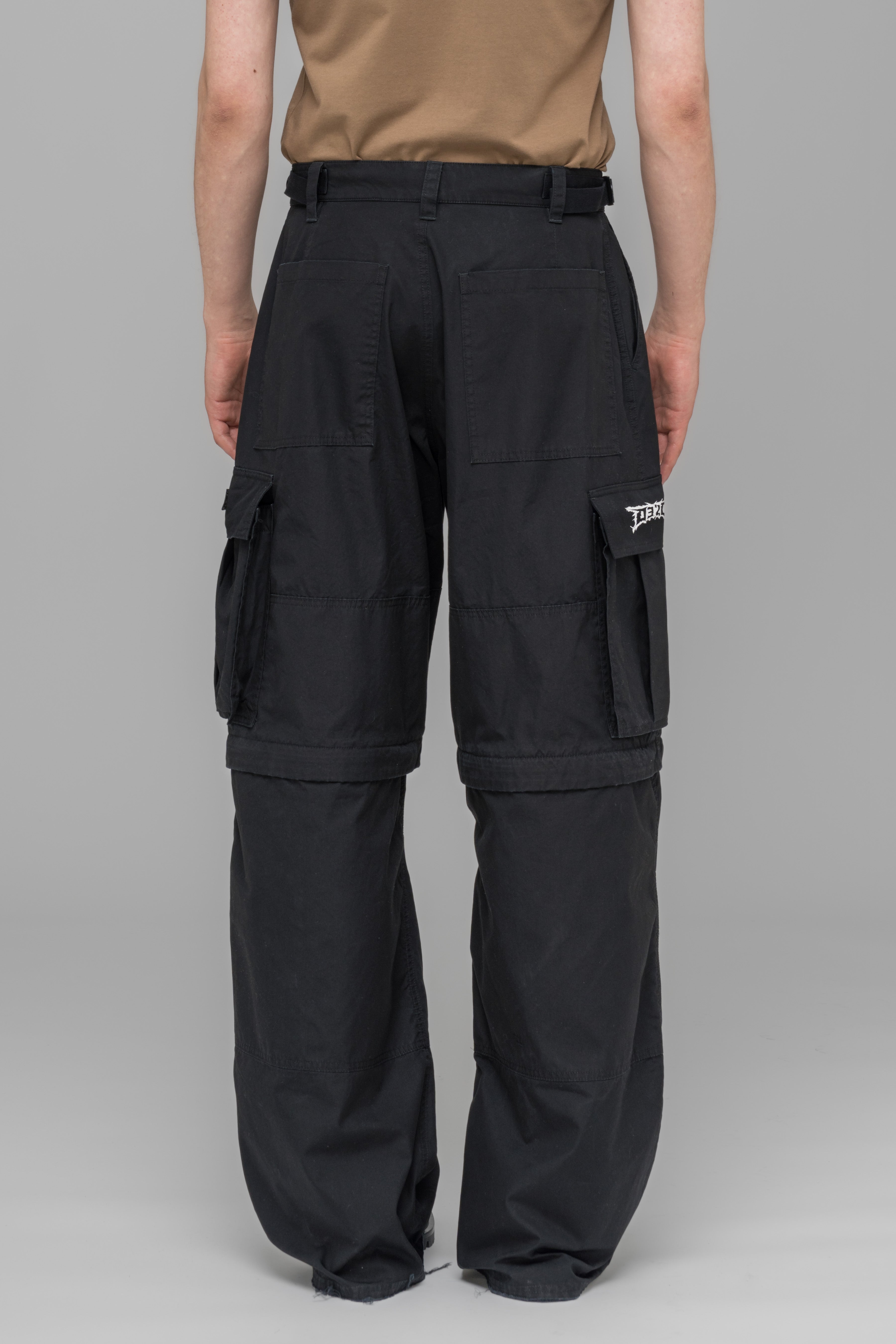 Baggy military style cargo pants with patch pockets, raw finishings at the hem and waist adjusters for a perfect fit. Constructed with a hidden zipper at the knee for detachable legs to convert into shorts. Equipped with an embroidered patch and a seasonal artwork screenprint.