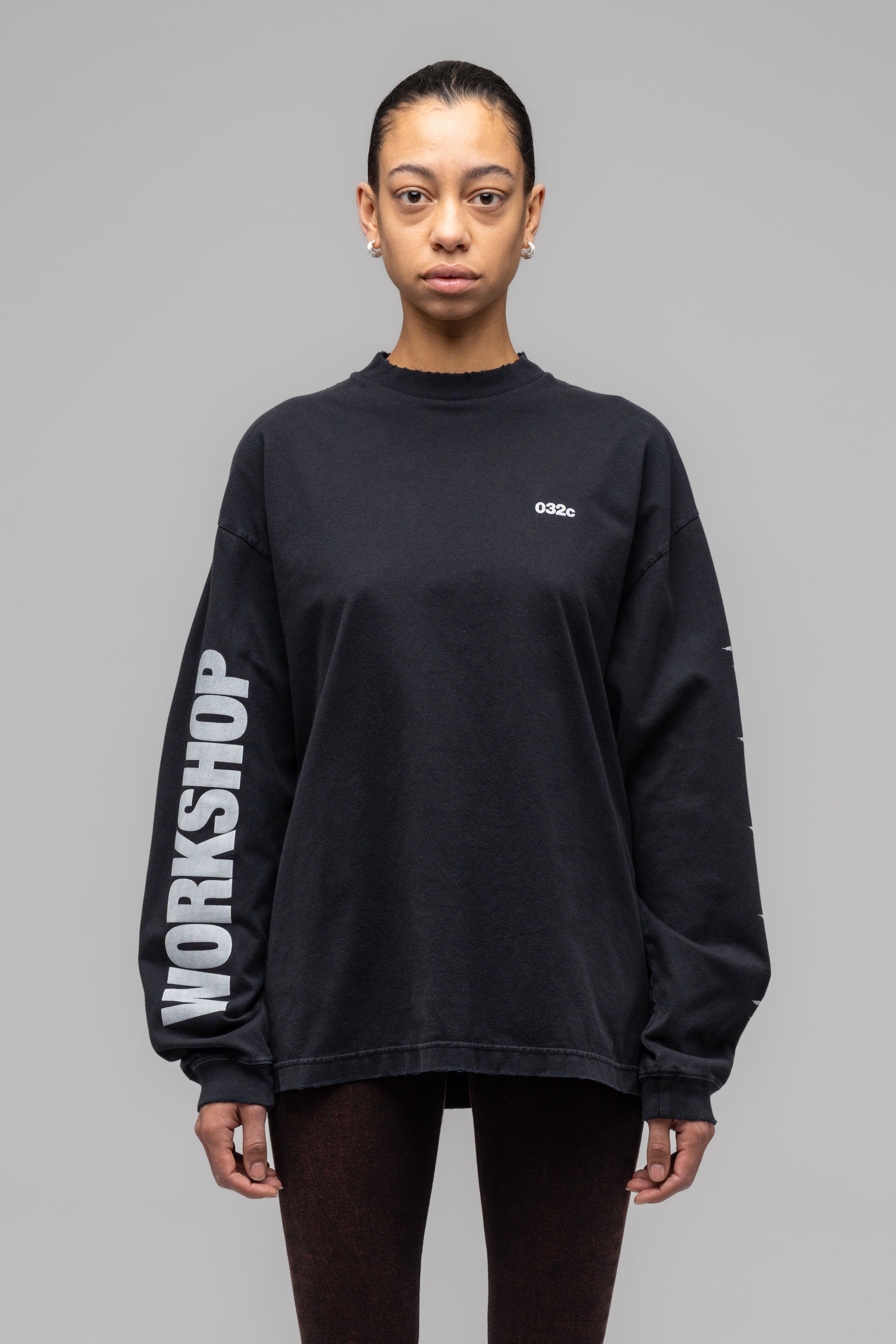 Distressed regular cut longsleeve in a faded black for an overall vintage feel.