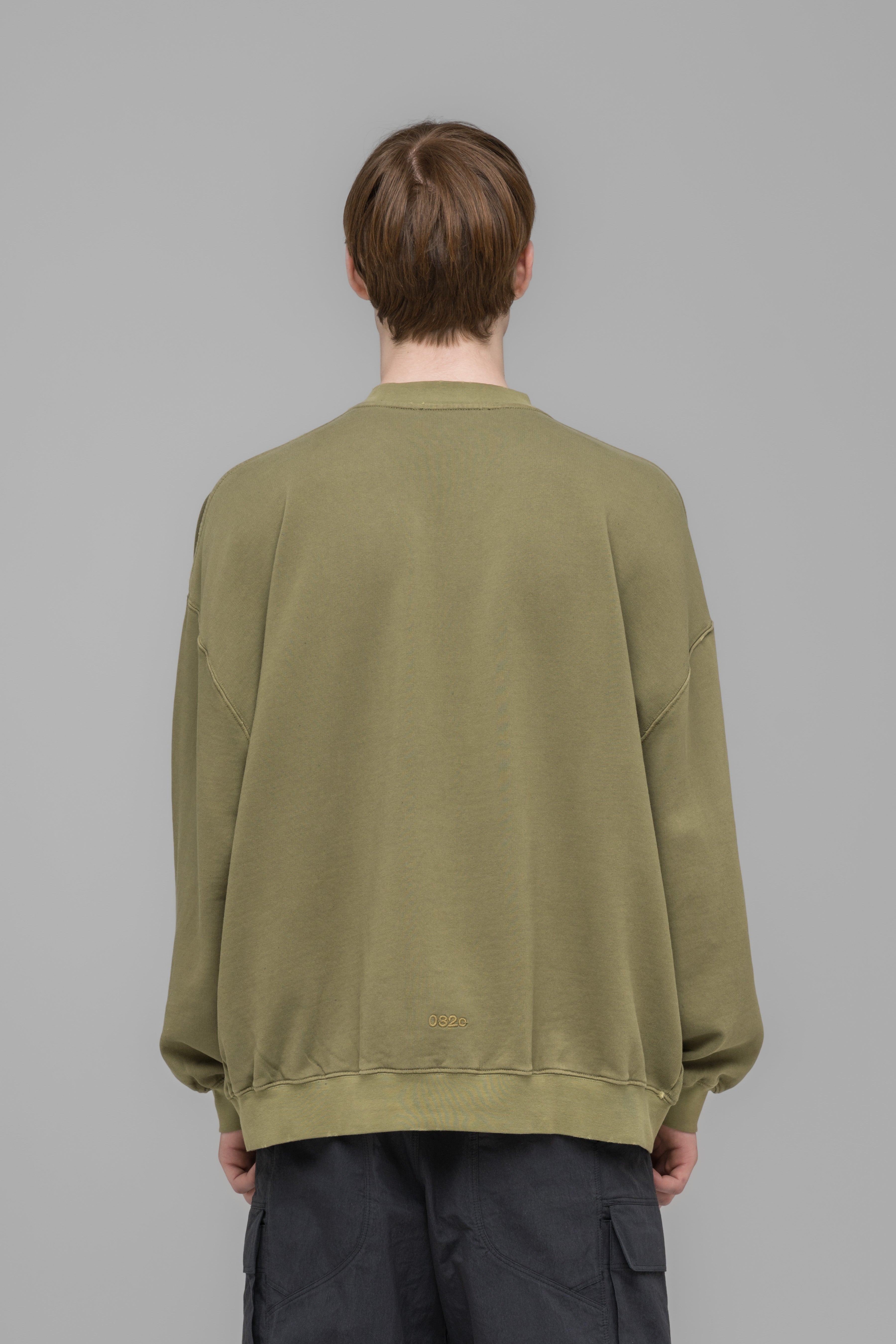 Our oversized fitted crewneck in faded green. Completed with single stroke screen print artwork and 032c logo embroidery. Distressed slightly for an overall vintage feel.