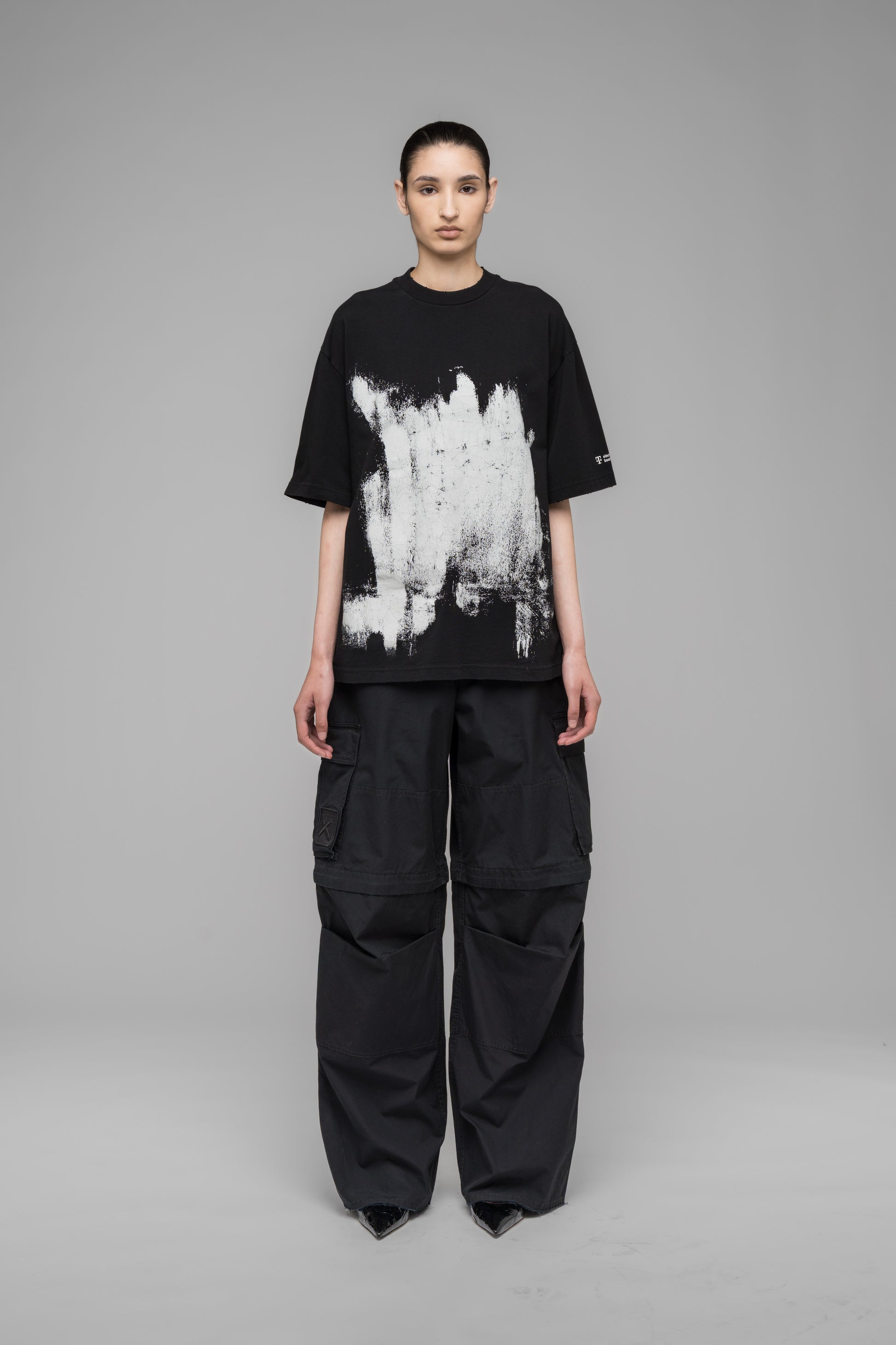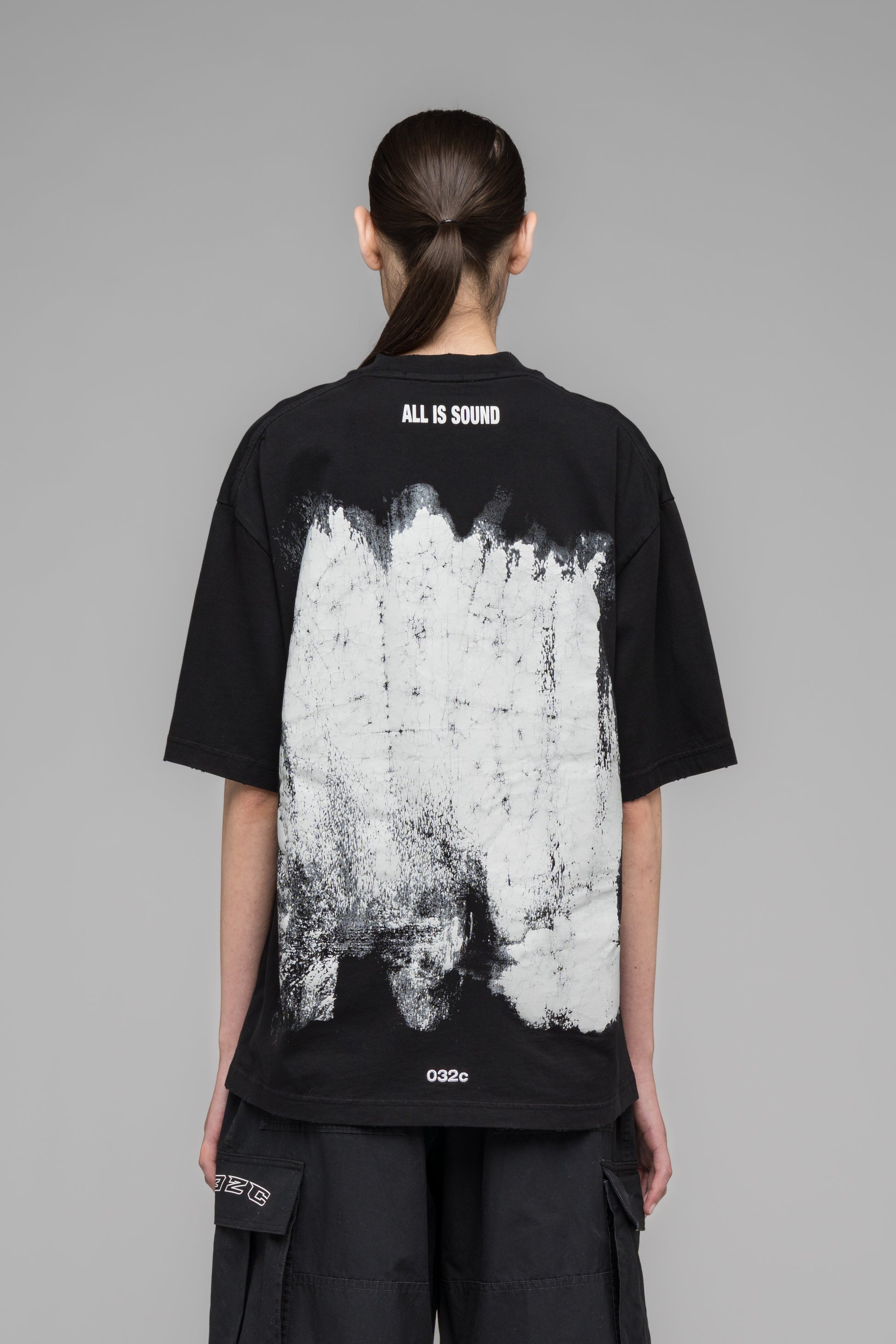The black cotton T-shirt combines a vintage feel with modern details, featuring faded colors, subtle distressing, and a chalky white cracked screen print.