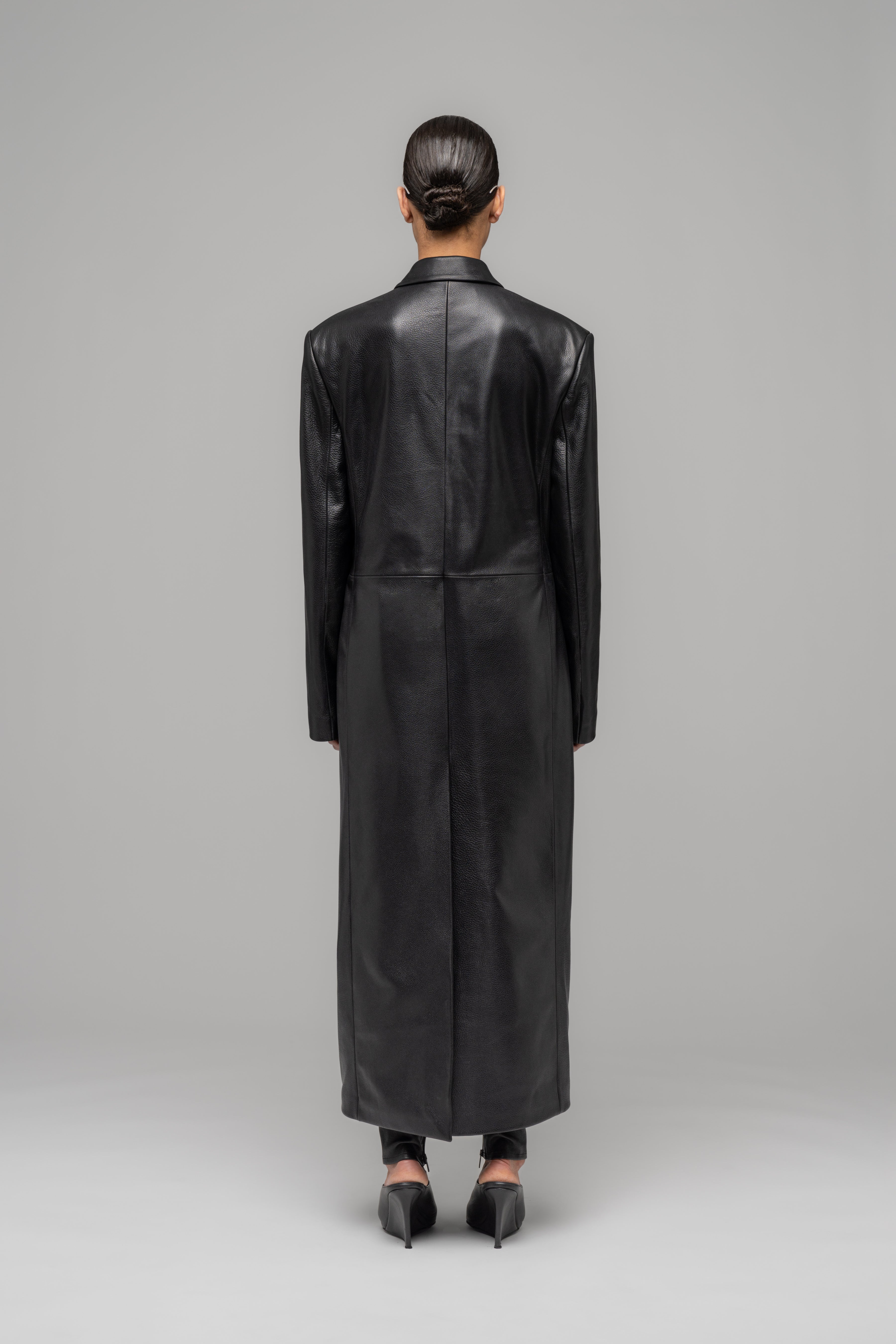 Double breasted full length coat in our buttery grainy calf leather, with an accentuated waist. Front tailored pockets, back vent with hidden snap closure. Classic 032c branded viscose lining at inside.