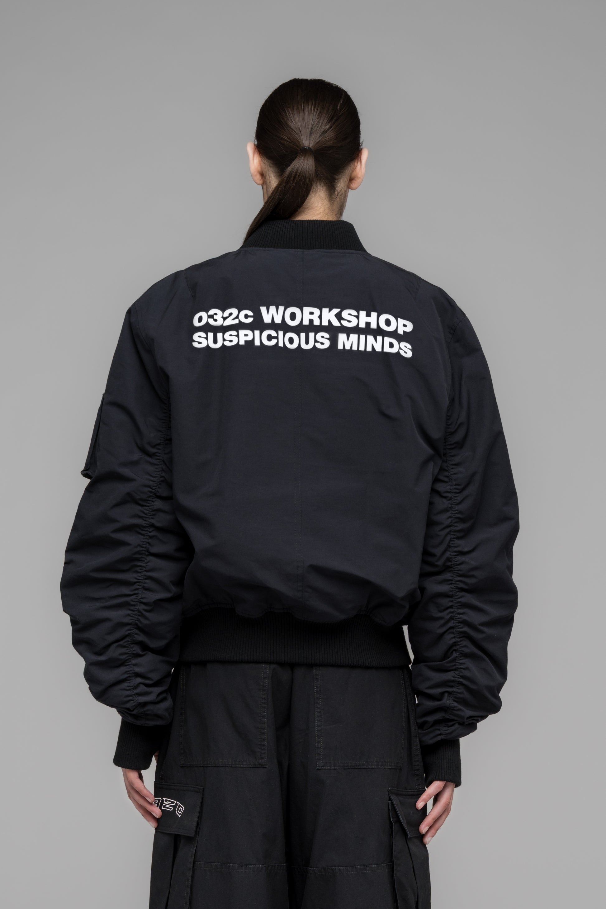 Bomber jacket with welt body pockets, sleeve patch pocket, ribbed collar and cuffs, and thumb-hole sleeve ribs. Features a 032c screen-printed chest logo, “Suspicious Minds” back artwork, and branded metal zipper puller.