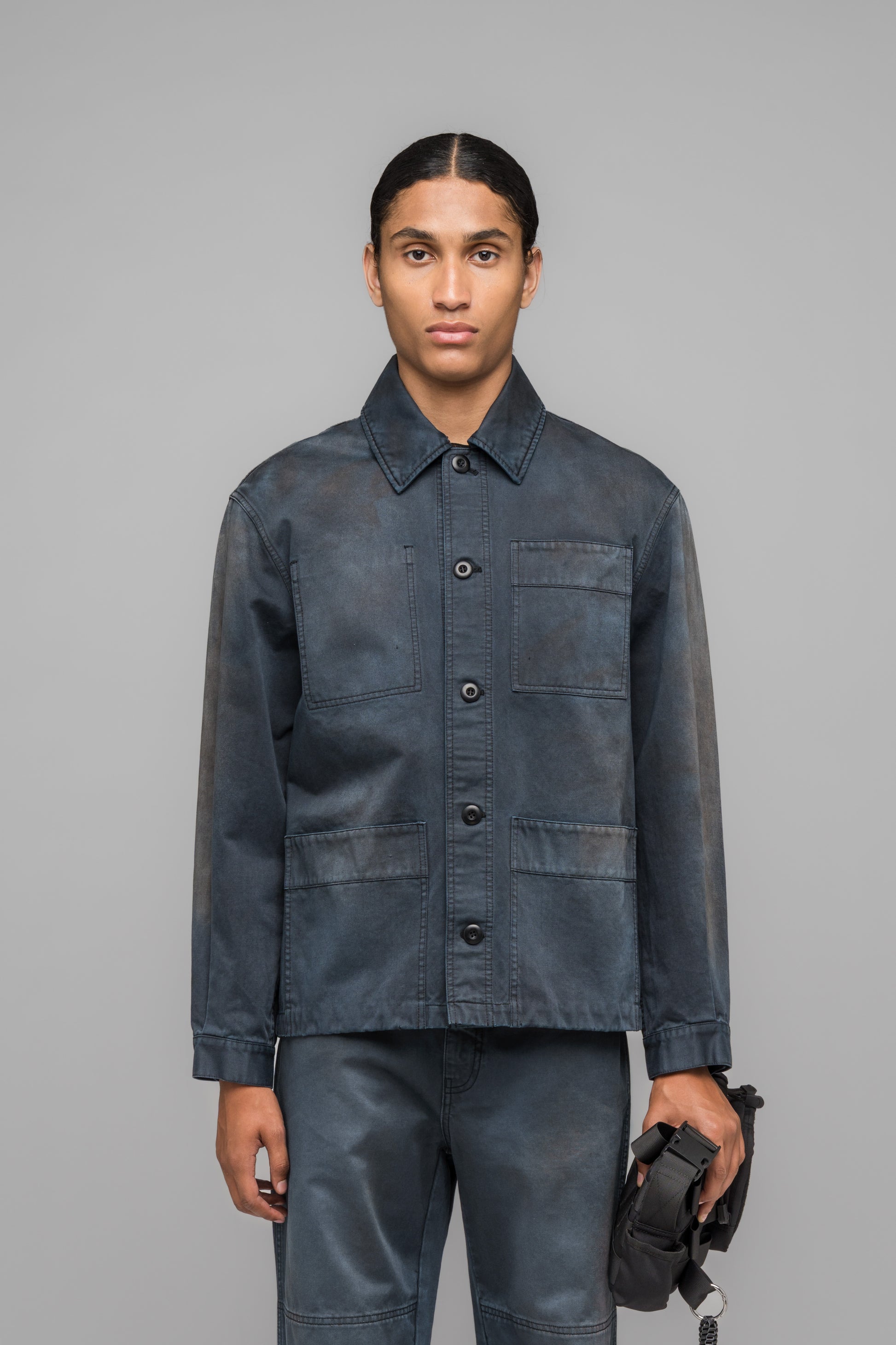 Workwear-inspired jacket with front flap pockets, an internal patched pocket, chest logo embroidery, and a stained stone wash treatment.